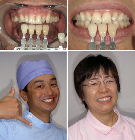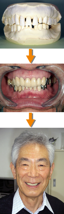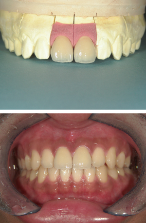 上顎の前歯部をセラミッククラウン(メタルボンドセラミックス)で治した状態です。